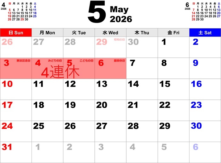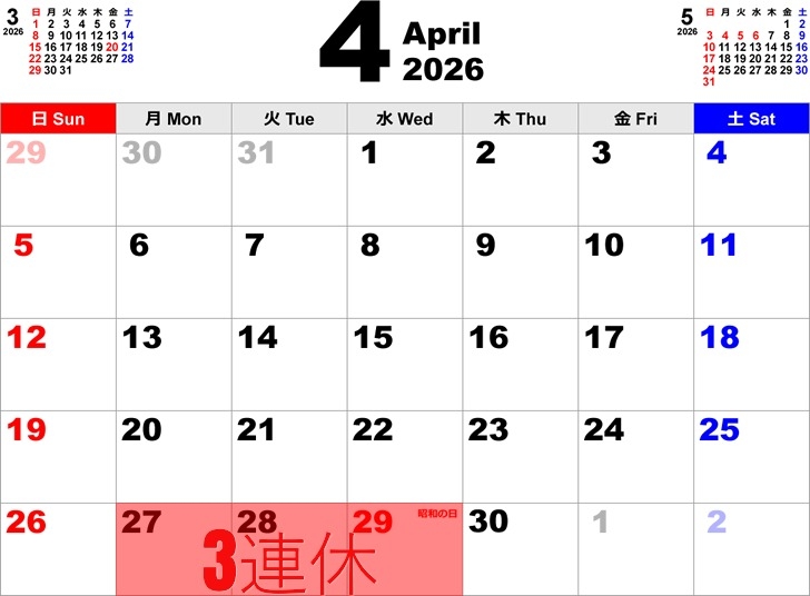 4月30日、5月1日、2日は通常営業です。